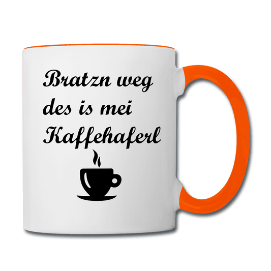 Tasse zweifarbig mit bayrischem Spruch Bratzn weg des is mei Kaffeehaferl