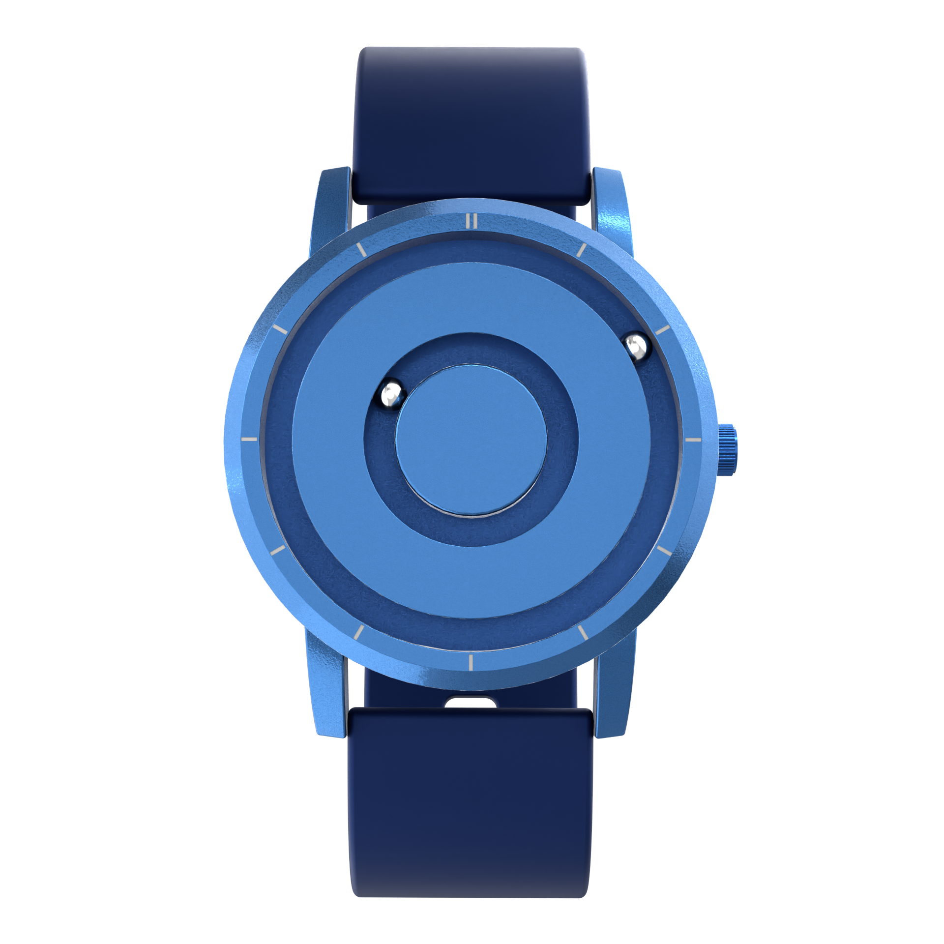 Futuristisch und mutig: Die Jupiter Blue präsentiert sich in einem kräftigen, leuchtenden Blau – vom Gehäuse bis zum Milanaisearmband. Die schwebenden Kugeln ersetzen klassische Zeiger und machen die Uhr zu einem Statement für alle, die Design und Technologie lieben. Auffallen garantiert.