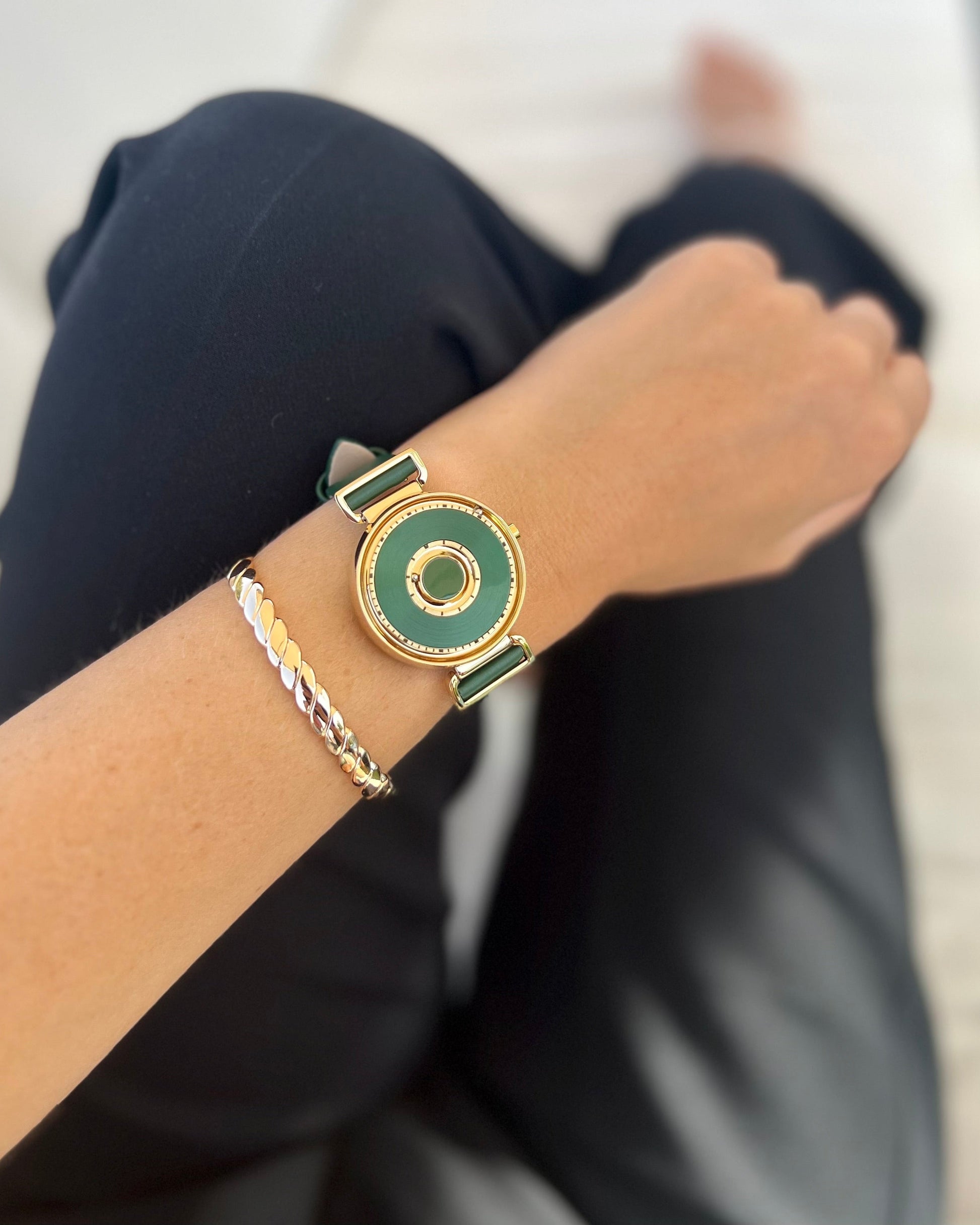 The Bella Gold Green women's watch from Magneto Watch combines timeless elegance with a touch of luxury. Its sophisticated green and gold dial harmonizes perfectly with the gold-tone case made of high-quality alloy, while the green satin leather strap completes the feminine and stylish look. Case diameter: 36 mm, case height: 10.5 mm. Perfect for women who appreciate classic beauty and exclusive details.