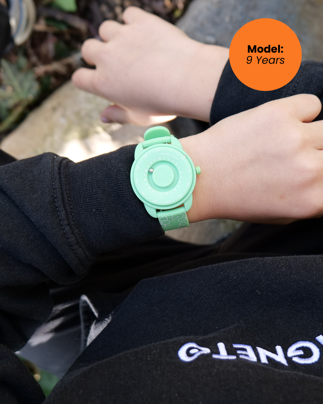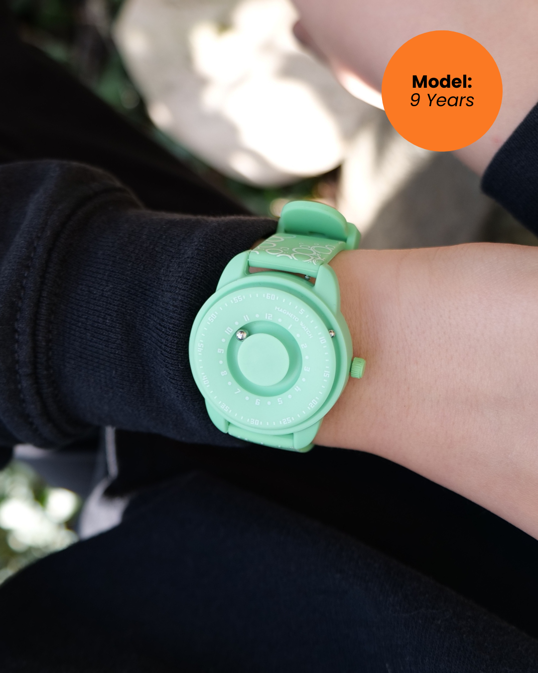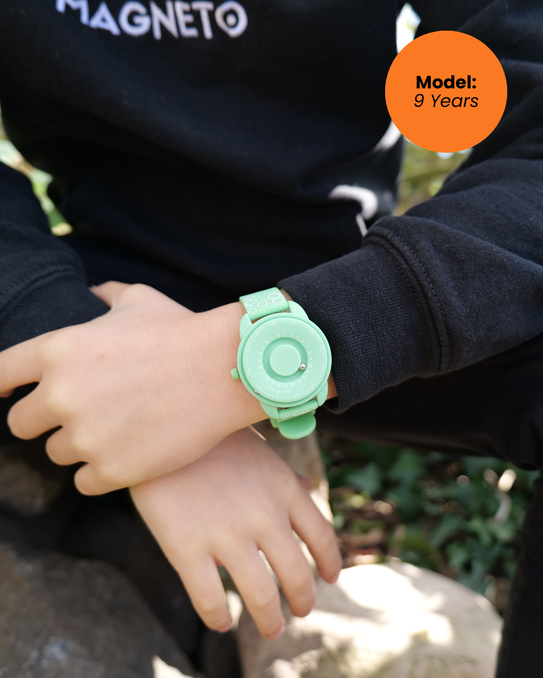 Bubbles Green by Magneto Watch brings a fresh splash of color to any child's wrist. Two magnetic spheres – a larger inner sphere for the hours and a smaller outer sphere for the minutes – make telling time an unusual experience that's sure to attract attention. The robust ABS plastic case is pleasantly lightweight, while the green silicone strap with its bubble-like print is reminiscent of soap bubbles. Learning to tell time becomes a fun experience – and children always have a cool eye-catcher on their wrist.