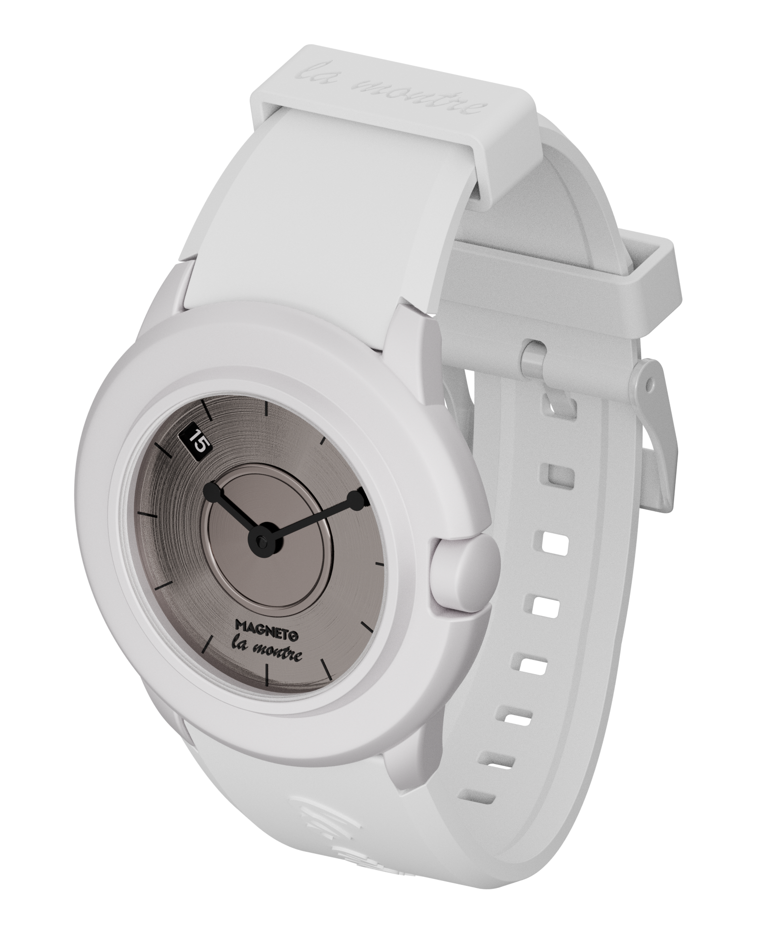The La Montre White by Magneto Watch is an elegant unisex timepiece featuring classic hands , with a circular hand tip that subtly references the brand's signature magnetic technology. The bioceramic case – an innovative composite of zirconium oxide ceramic and bio-based material – gives the watch lightness, robustness, and a modern, matte finish.