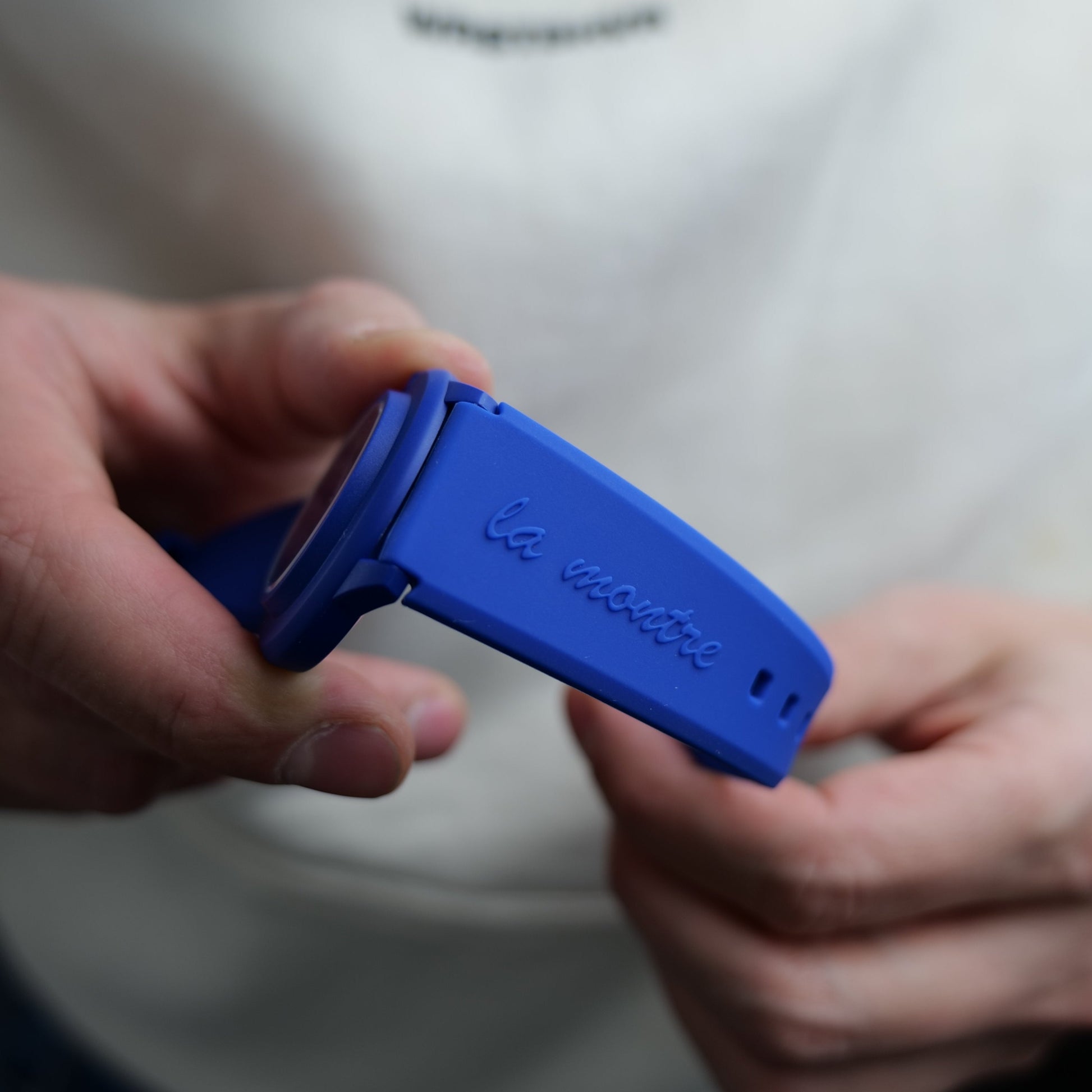 Ein besonderes Highlight ist die Datumsanzeige zwischen 10 und 11 Uhr – eine ungewöhnliche Position, die Blicke auf sich zieht und für Gesprächsstoff sorgt. Dazu harmoniert das rundgebürstete Aluminium-Zifferblatt, das dezente Lichtreflexe erzeugt. Komplettiert wird der Look durch das blaue Silikonarmband mit erhabener „La Montre“-Prägung und Dornverschluss, das für hohen Tragekomfort sorgt.